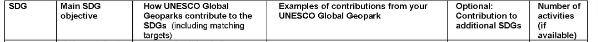 For the UNESCO Global Geoparks it is essential to be perceived and mentioned as active partners in the implementation and promotion of the SDGs in UNESCO´s sessions, meetings and publications on a regular basis. This requires a scheme and continuity of reporting by the UNESCO Global Geoparks regarding all activities, which underline, how they support the SDGs.